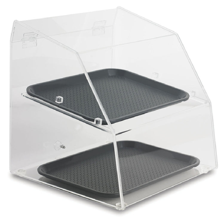 The Vollrath SBC1014-2R-06 display case features an acrylic construction with precise dimensions of 14.5 inches in width, 14.25 inches in depth, and 15.25 inches in height, weighing approximately 11 pounds. It supports a full-service, non-refrigerated operation with an emphasis on durability and ease of cleaning. The unit includes a rear acrylic door for effortless inventory access and maintenance, and its design accommodates two 10" x 14" trays for versatile merchandising. Its lightweight yet sturdy construction ensures stability and durability for countertop use in various foodservice settings.