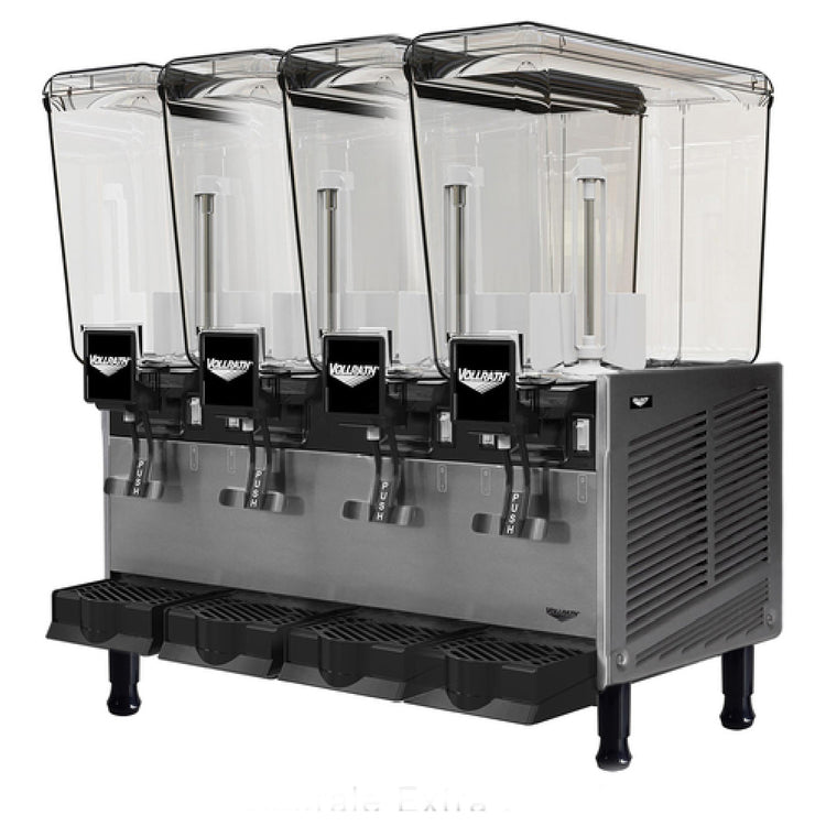 The Vollrath VBBE4-37-S Vollrath Pre-Mix Refrigerated Beverage Dispenser Electric is a commercial-grade cold beverage dispenser designed for professional foodservice environments. This self-contained unit features four 5.3-gallon polycarbonate food-grade bowls with stirring paddle circulation for consistent product mixing. Its temperature range of 35°F to 41°F is controlled independently by a dedicated thermostat for each bowl, ensuring precise chilling. Constructed with a stainless steel unibody cabinet, this beverage dispenser offers durability and corrosion resistance, making it suitable for high-traffic hospitality settings such as restaurants, cafes, and event venues. With gravity-fed operation, stainless steel spigots, and ABS plastic drip trays, it facilitates efficient workflow and sanitation in busy commercial kitchens.