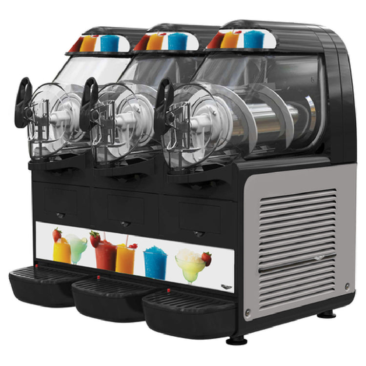 The Vollrath VCBA168-37 Frozen Beverage Granita Machine is a commercial countertop unit designed for efficient preparation of non-carbonated frozen beverages and granitas. Featuring three independently controlled 1.58-gallon bowls and a magnetic drive system, this model provides precise consistency and temperature regulation. Its compact dimensions of 23-1/2 inches width by 19-1/2 inches depth and 23-3/4 inches height make it suitable for limited space environments like cafes, concession stands, and dessert bars. Built with robust materials, it operates on standard 120V power and incorporates a large compressor for reliable cooling performance, making it an optimal solution for moderate-volume beverage service in foodservice operations requiring consistent quality and ease of maintenance.