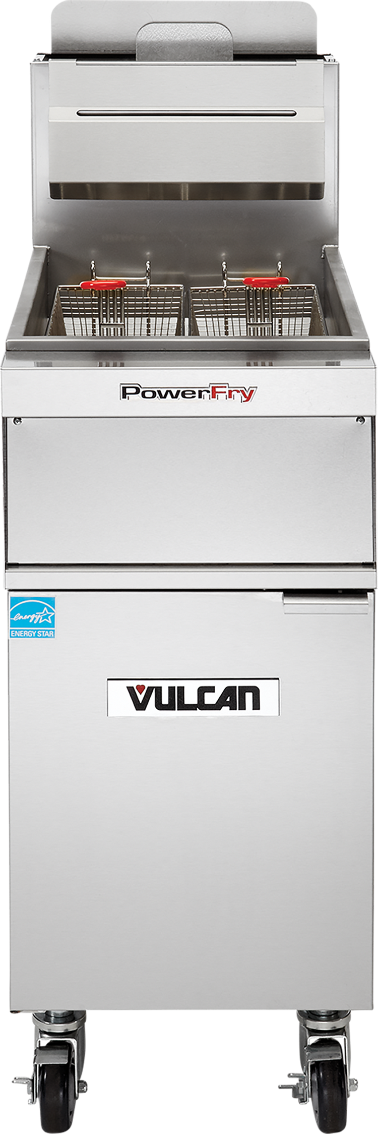 The Vulcan 1VK45A_NAT PowerFry5™ Fryer Gas High Efficiency is a commercial-grade deep fryer designed for high-performance cooking in professional foodservice environments. This floor-model fryer features a 15-1/2" width stainless steel cabinet with a stainless steel fry pot, supporting a capacity of 45-50 lbs. It is equipped with solid state analog control knobs including melt cycles, and incorporates the FivePass™ heat transfer system for optimized heat retention. Powered by 70,000 BTU, it provides rapid recovery and consistent frying results. Its energy-efficient design with ENERGY STAR® certification ensures reduced operational costs, making it suitable for busy restaurant kitchens and high-demand fry stations.