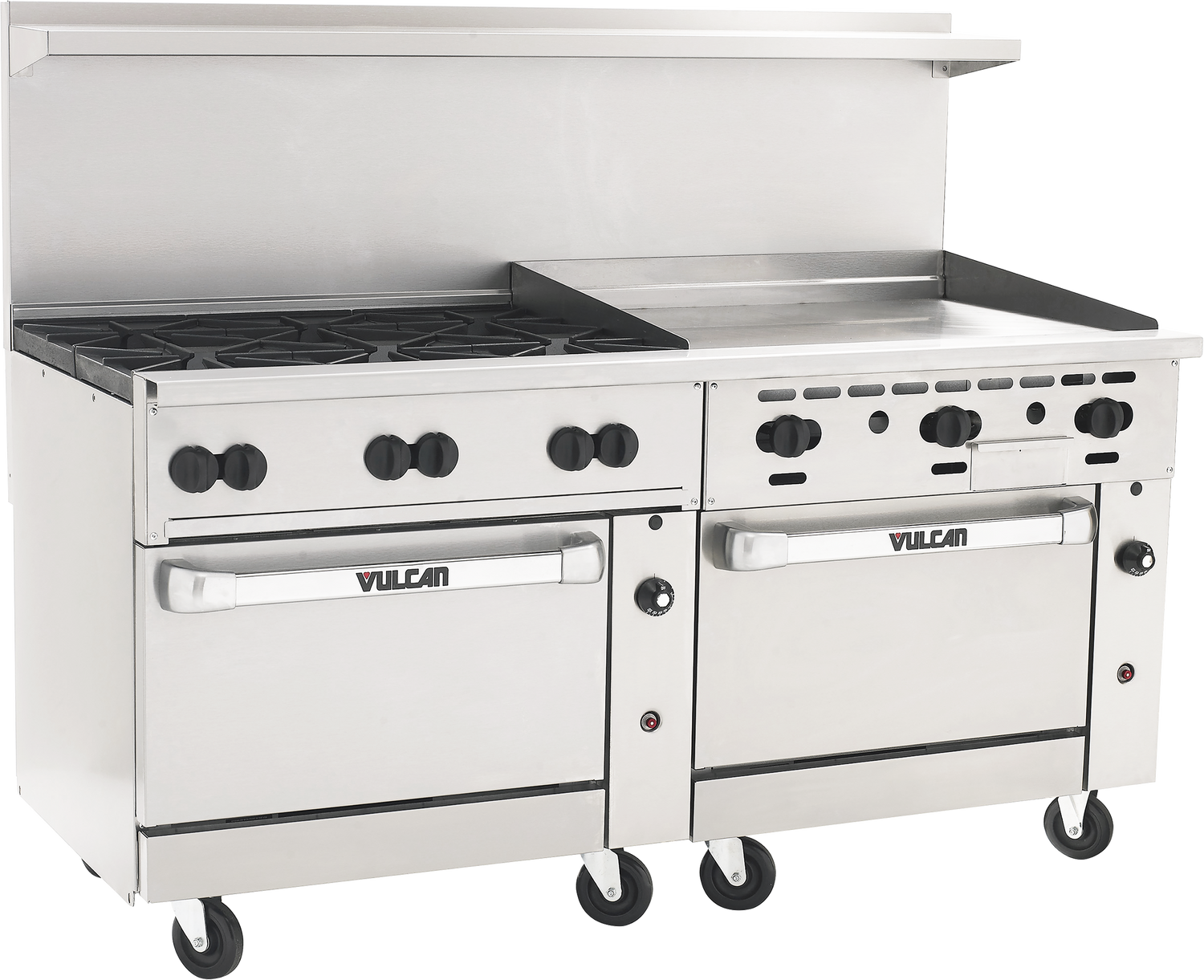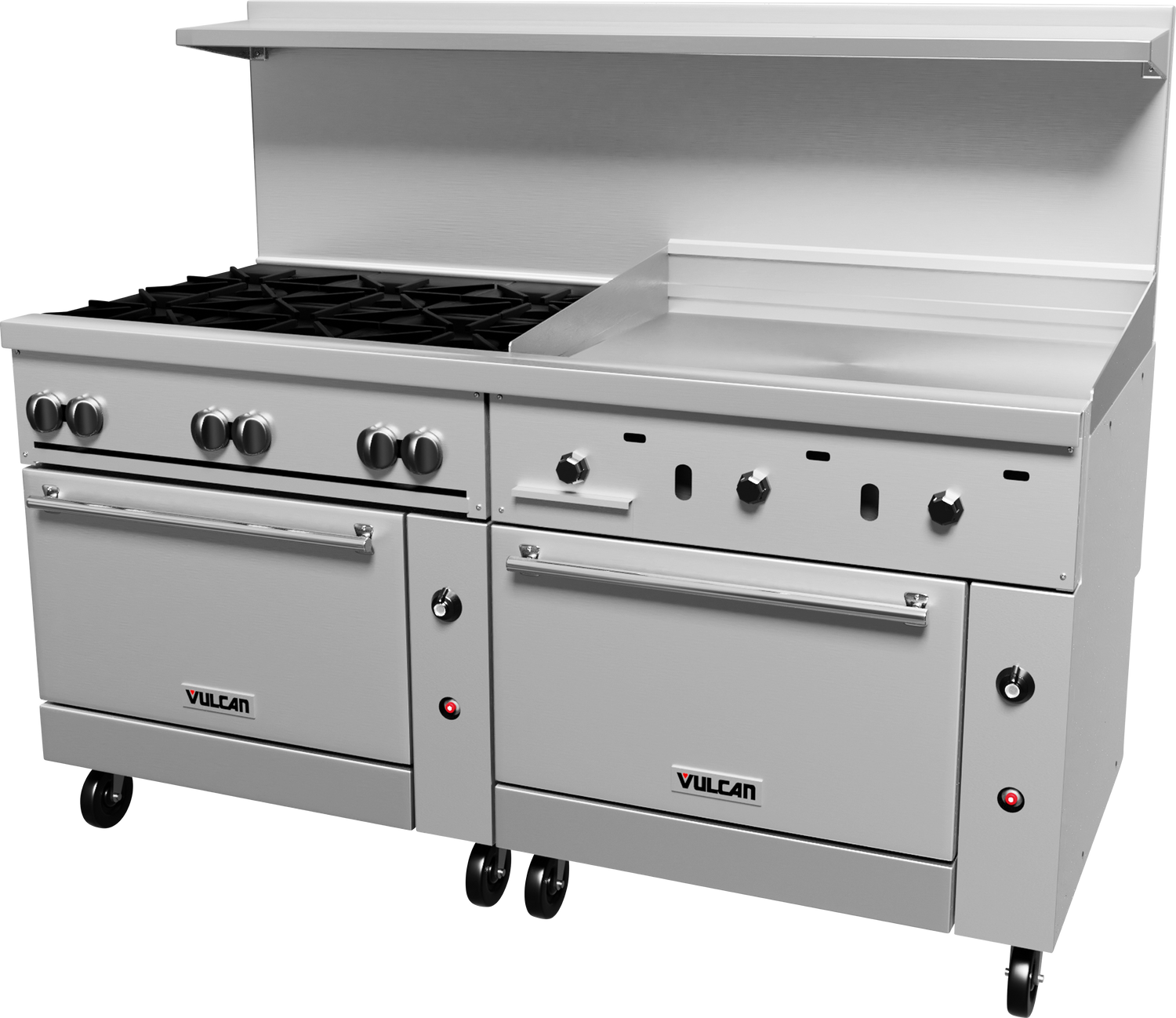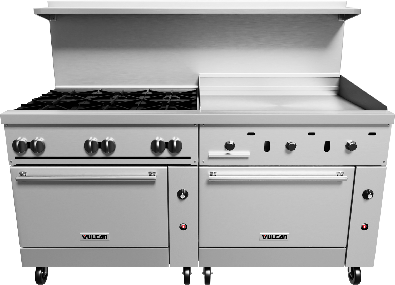 A commercial restaurant range is a heavy-duty cooking appliance designed for professional foodservice establishments, combining multiple burners, griddles, and ovens into a single unit to support diverse cooking tasks. The Vulcan 72SS-6B36GP Endurance™ Range features six high-capacity burners, a steel griddle, and dual oven bases, making it suitable for mid-volume restaurant kitchens or institutional settings. It is engineered for durability, efficiency, and ease of maintenance, with a stainless steel build prepared for constant daily use, supporting complex menu preparation in busy culinary environments.