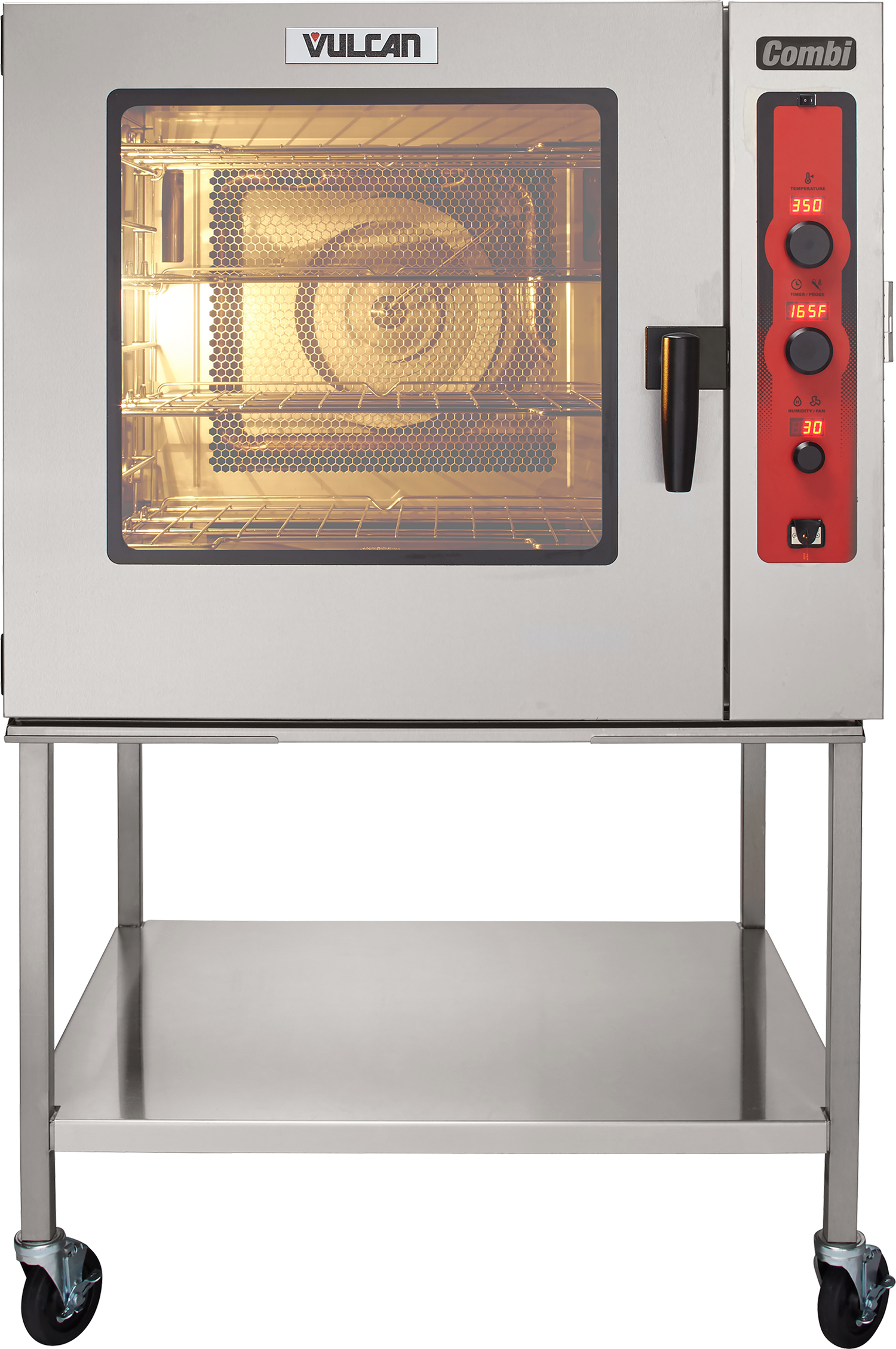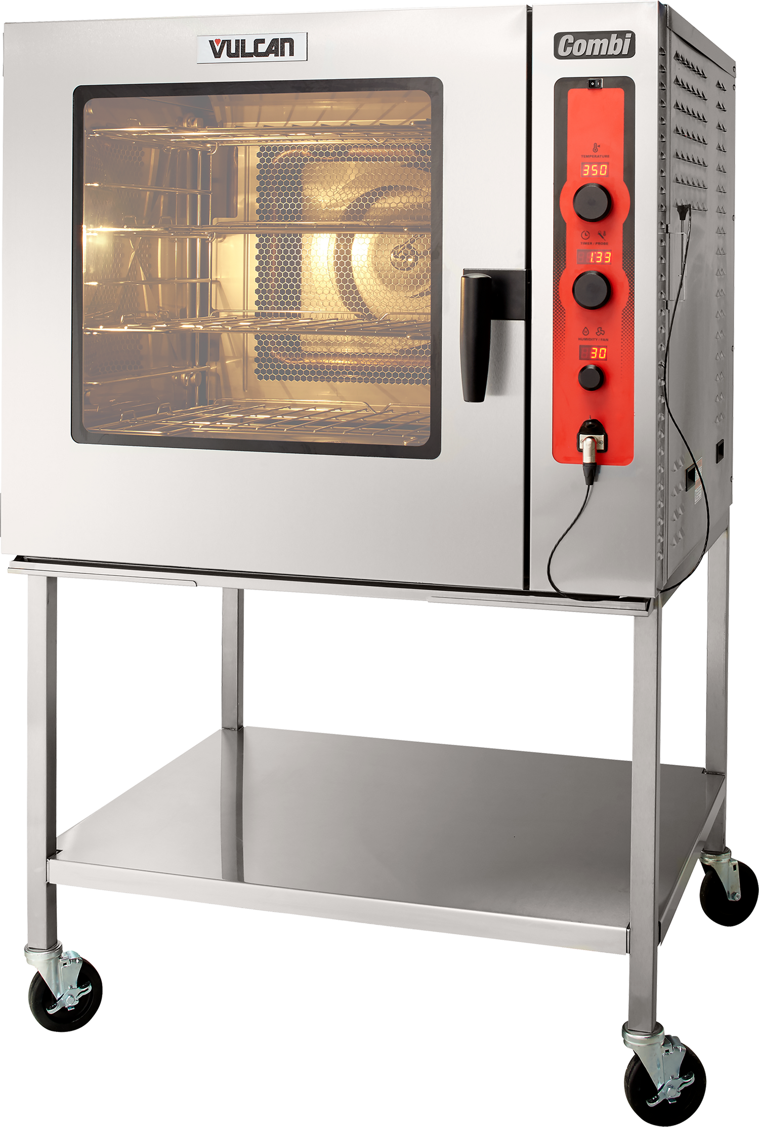 A commercial stainless steel Vulcan boilerless Combi oven steamer on wheels, with a glass door showing interior racks and a lit interior. The right side features a red control panel with dials and digital display. An open shelf is below the oven.