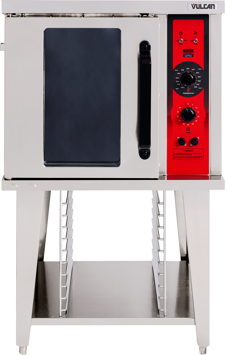 The Vulcan convection oven offers precise temperature control, quick heat-up, and energy-efficient operation, with user-friendly solid state controls and a 60-minute timer. Its stainless steel construction provides durability in demanding environments, while porcelain interior facilitates effortless cleaning. Designed for medium-volume baking, it fits seamlessly into commercial kitchens requiring consistent results and minimal maintenance, supporting workflow efficiency and food safety standards.