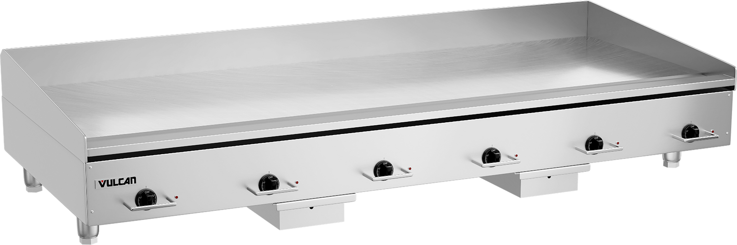 Vulcan, HEG72E_208/60/3, Heavy Duty Griddle, electric, countertop, 72" W x 24" D cooking surface, 3/4" thick polished steel griddle plate, bottom mounted snap action thermostat every 12", low profile, stainless steel front, sides, front top ledge with "Cool Bullnose", (2) front grease trough, 4" back & tapered side splashes, 4" adjustable legs, CSAus, NSF