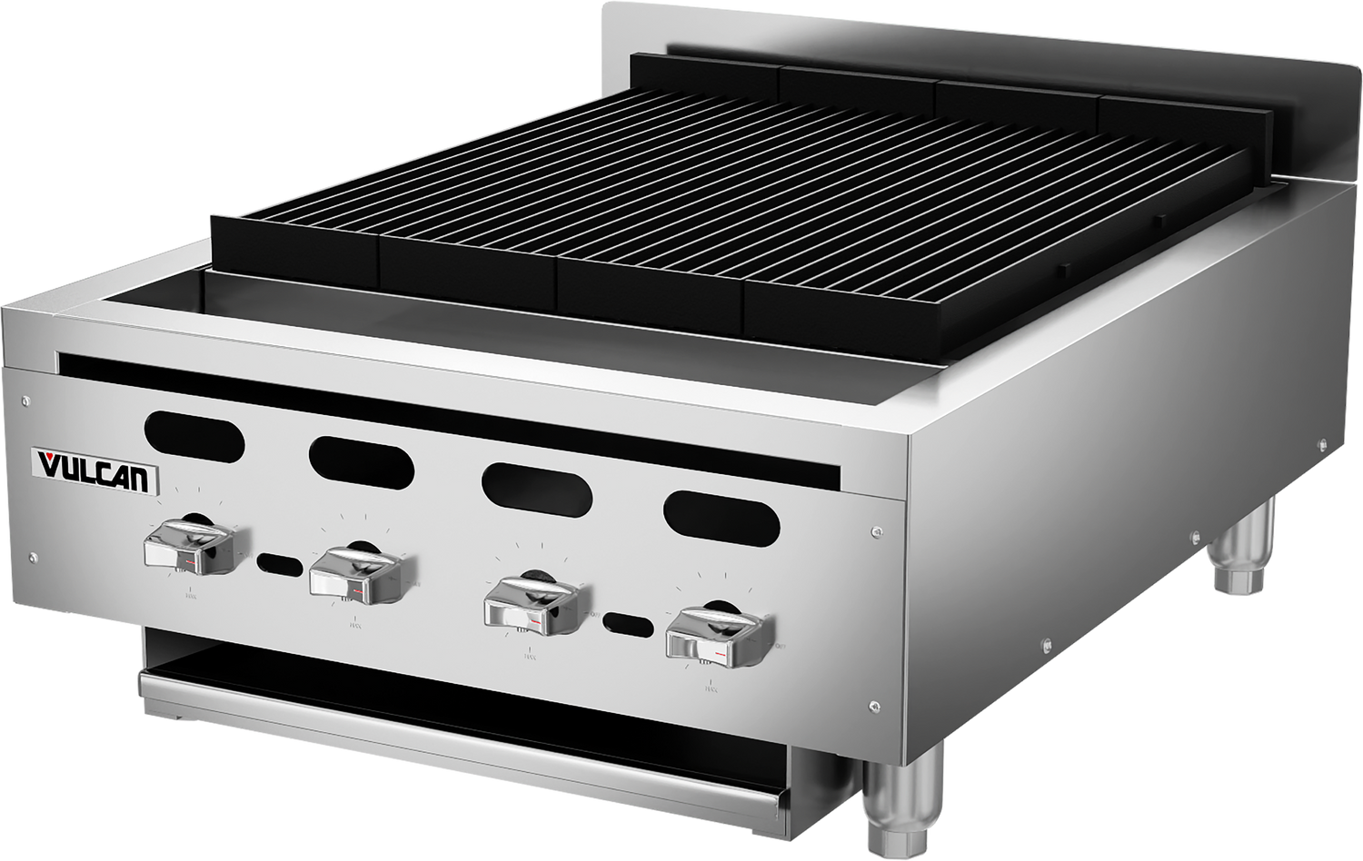 Vulcan, VACB25_NAT, Achiever Charbroiler, countertop, 25-1/8", (4) 17,000 BTU cast iron burners, infinite heat control valves, fully welded chassis, (1) drip tray, stainless steel front, sides & top trim, backsplash & grease trough, 4" adjustable legs, 68,000 BTU, CSA, NSF