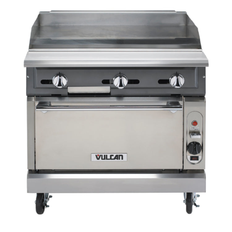 The Vulcan VGM36B_NAT V Series Heavy Duty Range Gas 36" is a commercial-grade cooking appliance designed for high-demand foodservice environments. It features a robust 36-inch wide gas range with a 3/4-inch thick polished steel griddle plate, providing superior heat retention and durability for intensive cooking tasks. Equipped with manual controls, stainless steel front, sides, and a cabinet base, this model combines resilience with ease of operation. Its 90,000 BTU burner output supports rapid heating and consistent temperatures essential for professional kitchens requiring reliable performance. The unit's construction and precise specifications make it suitable for fast-paced restaurant, cafeteria, and institutional kitchens seeking durable, efficient cooking solutions.
