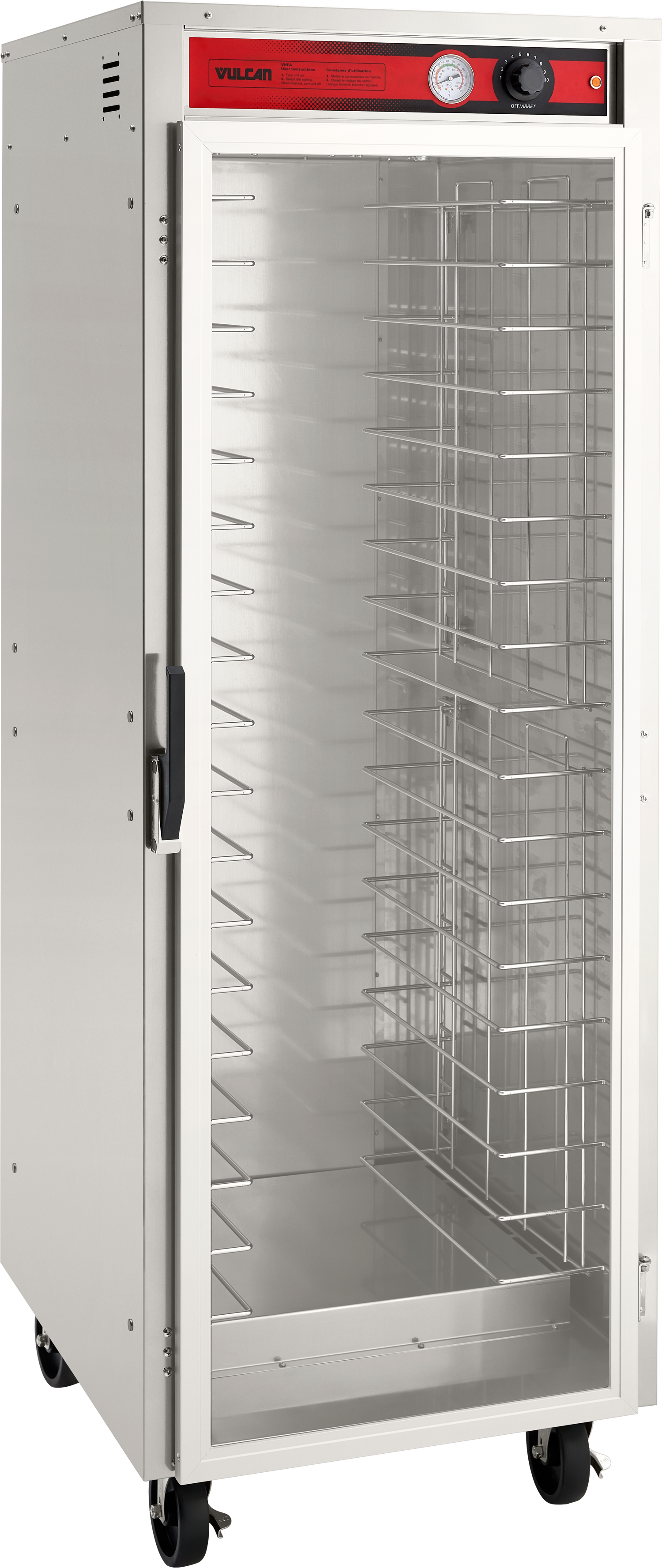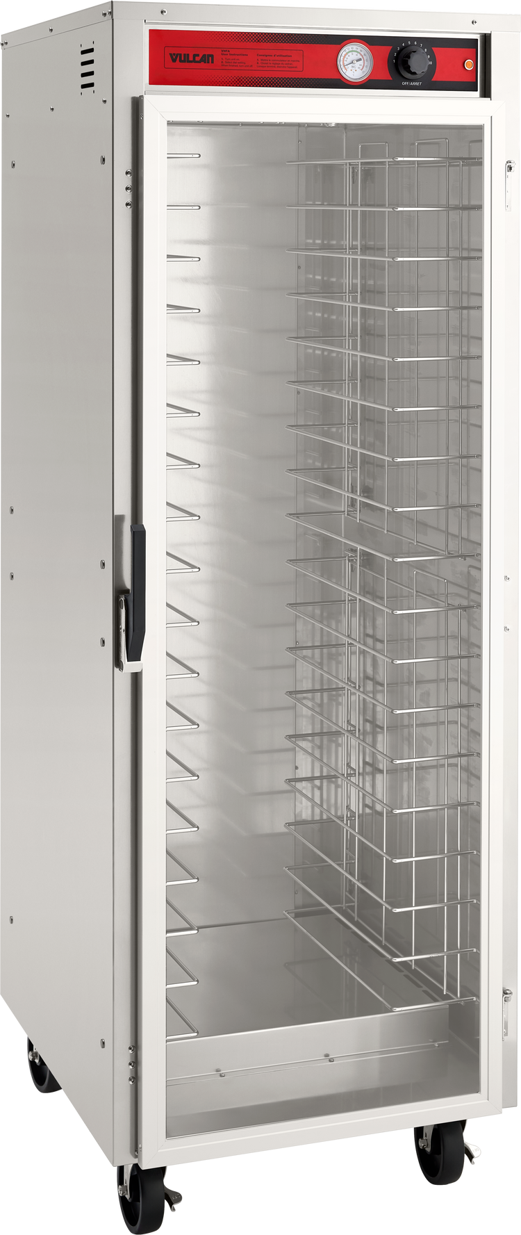 Vulcan, VHFA18-1M3PN, Heated Cart, mobile, non-insulated, capacity (18) 18" x 26" x 1" sheet pans or (36) 12" x 20" 2-1/2" steam table pans, fan & air tunnel, fixed tray slides 3" OC, glass door, stainless steel construction, 5" casters, 2 swivel, 2 rigid with locks, 120v/50/60/1-ph, 2.0kW, 16.7 amp, cord with NEMA 5-30P, cULus, UL EPH (Canadian plug requirement)