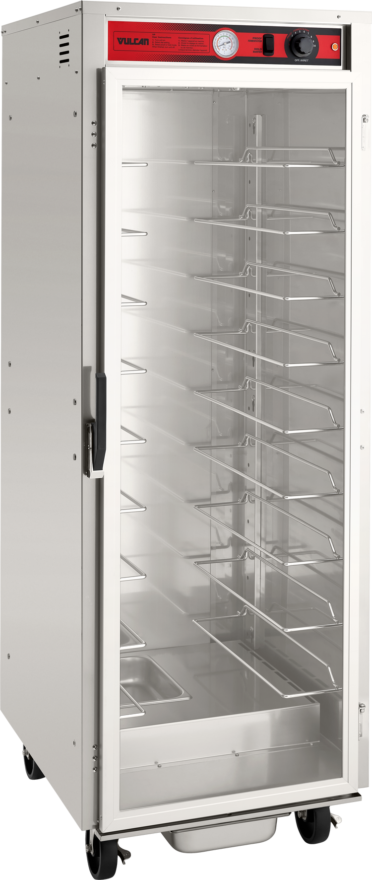 Vulcan, VP18-1M3PN, Proofing Heated Cabinet, mobile, non-insulated, (18) 18" x 26" x 1" sheet pans or (36) 12" x 20" x 2-1/2" steam table pans, fan & air tunnel, includes (10) pair of adjustable tray slides 3" OC, 1/2 gallon water pan, switch can be set to proof or set for heated holding up to 190° F, glass door, stainless steel construction, includes drip trough & removable drip pan, 5" casters, 2 swivel, 2 rigid with locks, 120v/50/60/1-ph, 2.0kW, cord with NEMA 5-30P, cULus, UL EPH (Canadian plug requirement)