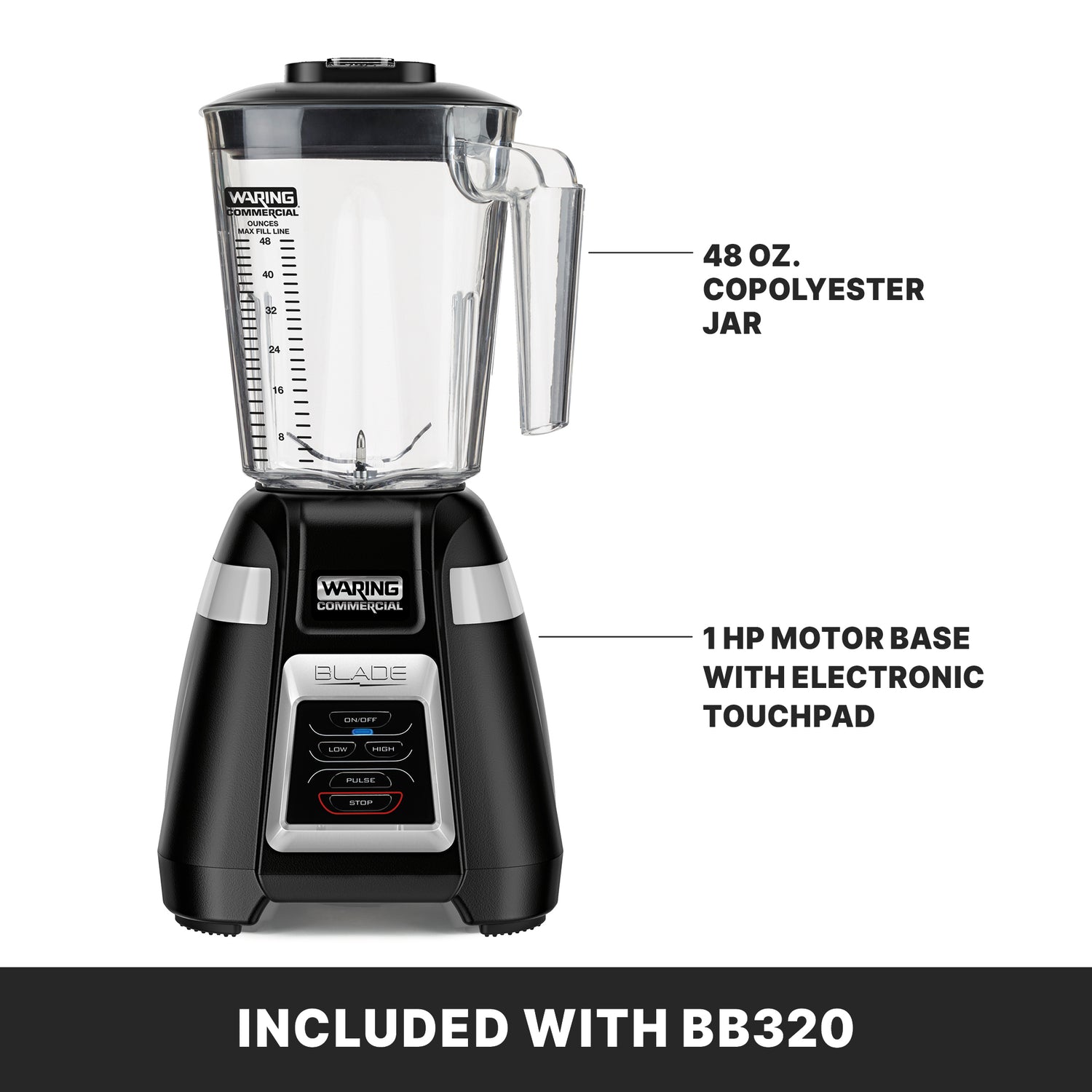 The Waring BB320 Blade Bar Blender is a commercial-grade blending device designed for efficient operation in foodservice environments. Featuring a 48-ounce durable plastic container and a robust 1-horsepower motor, this blender offers two-speed functionality with a pulse setting, ideal for precise texture control. Its electronic touchpad controls enable seamless operation, while a rubber jar pad provides stability during heavy-duty use. Crafted in the USA, the BB320 is suitable for bar, beverage, and food preparation applications requiring consistent performance and easy maintenance in moderate workload settings.