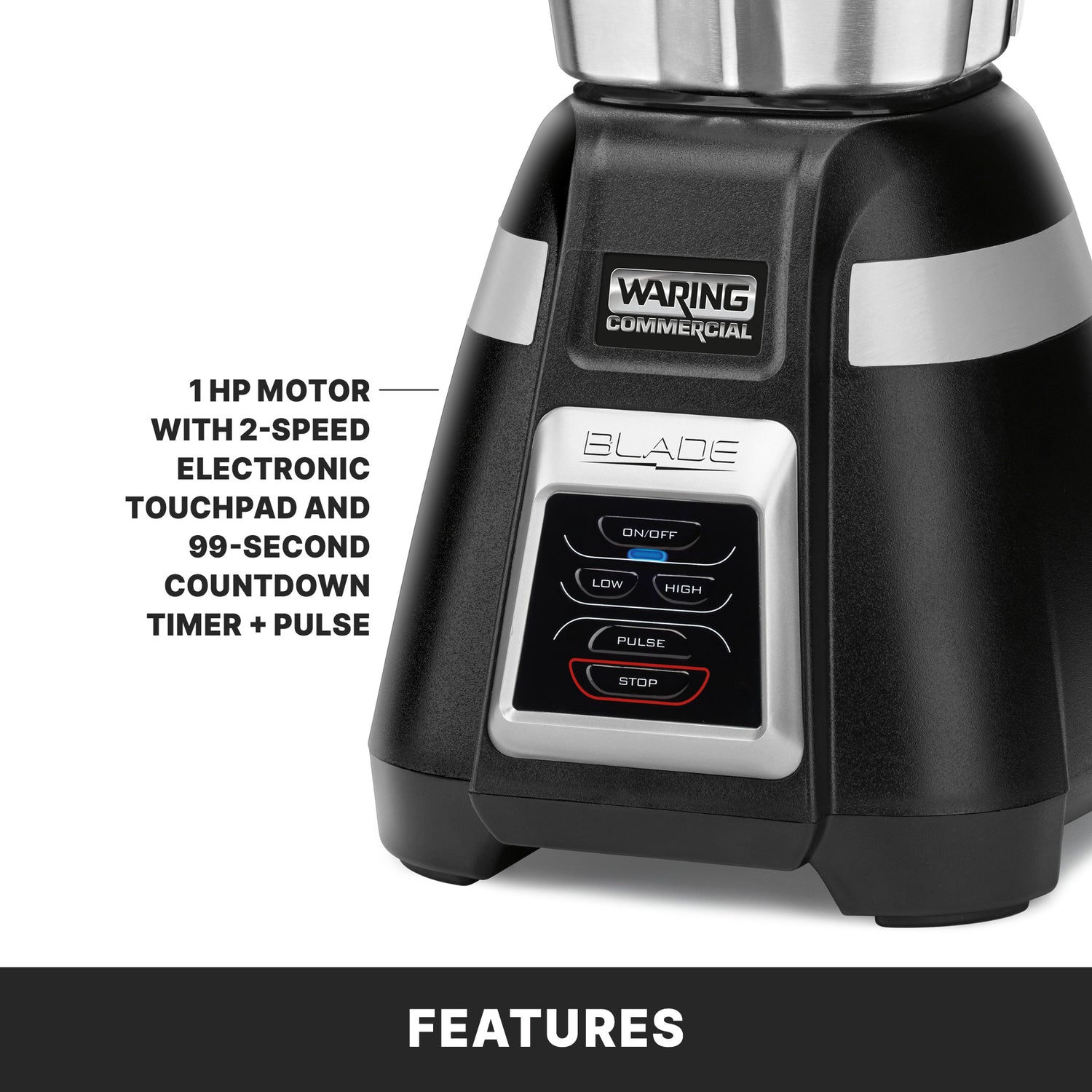 The Waring BB340S Blade Bar Blender is a commercial-grade blending appliance designed for high-performance foodservice environments. Featuring a 48-ounce stainless steel container, this bar blender is equipped with a 2-speed motor and pulse function, enabling precise control over texture and consistency. Its electronic touchpad controls incorporate a 99-second countdown timer for streamlined operation. The unit operates on 120V/60Hz power, delivering 750 watts and 1 horsepower, making it suitable for moderate throughput applications such as beverage stations and hotel bars. Its durable stainless steel construction, combined with a rubber jar pad for stability, ensures longevity and reliable performance in busy commercial kitchens.