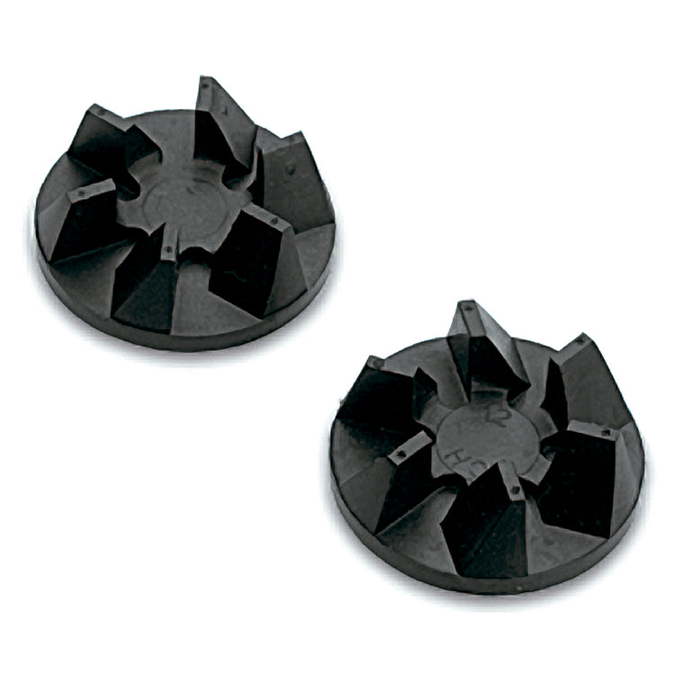 Two round, black plastic objects with raised, angular fins arranged in a circular pattern on top. Resembling gears, these are likely BB150 Waring components for a Clutch Repair Kit, both shown against a white background.