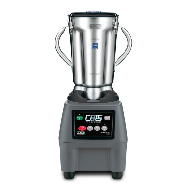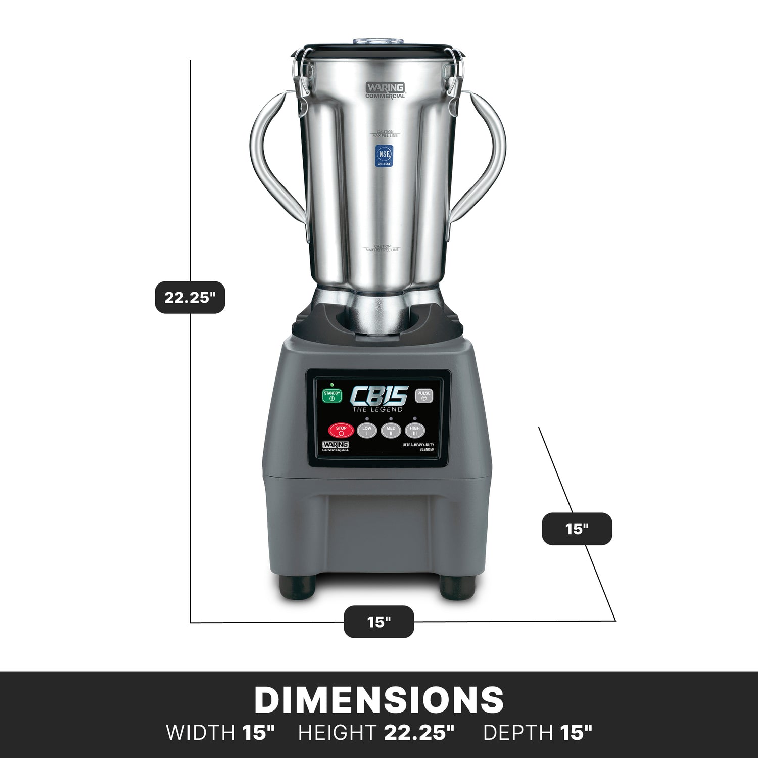The Waring CB15 Food Blender Heavy-duty is a commercial-grade countertop blending unit designed for high-efficiency food processing in professional kitchens. Equipped with a robust 3.75 HP motor and featuring a removable stainless steel container with two handles, it delivers consistent power and durability for large-volume applications. Its electronic membrane keypad allows for precise speed control with three speeds plus pulse, supporting versatile mixing, pureeing, and blending tasks. Measuring 14-7/8 inches in width, 15 inches in depth, and standing 26 inches high, this unit is engineered for reliable operation in high-demand foodservice environments, handling a 1-gallon capacity with ease. Constructed with a die cast base and stainless steel container, it ensures longevity and ease of maintenance, making it ideal for commercial kitchens requiring heavy-duty blending performance.