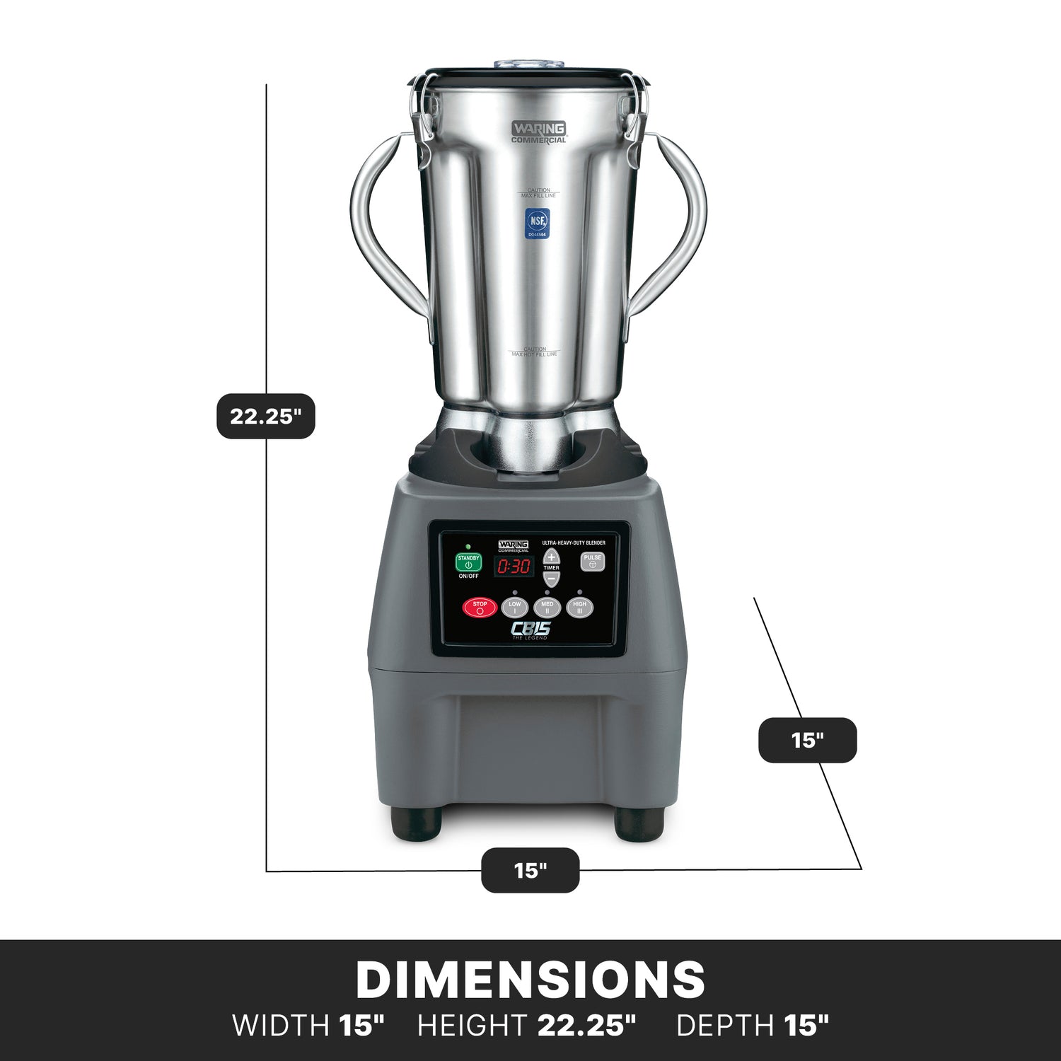 The Waring CB15T features a 3/4 HP motor operating on 120V, 60Hz, single-phase electrical supply, with a maximum current draw of 15 amps. Its air-cooled motor system ensures reliable performance during extended use. The appliance's dimensions are 14-7/8" width, 15" depth, and 26" height, with a weight of approximately 38.6 lbs. The stainless steel construction guarantees durability and food safety, compatible with standard cleaning routines. Its self-contained design includes a clear lid and stainless steel container for robust performance, suited for continuous blending tasks. The unit’s operating range allows for efficient food processing, making it ideal for batching, pureeing, and ingredient preparation in commercial kitchens. Other key features include cETLus and NSF compliance, ensuring safety and sanitation standards are met.