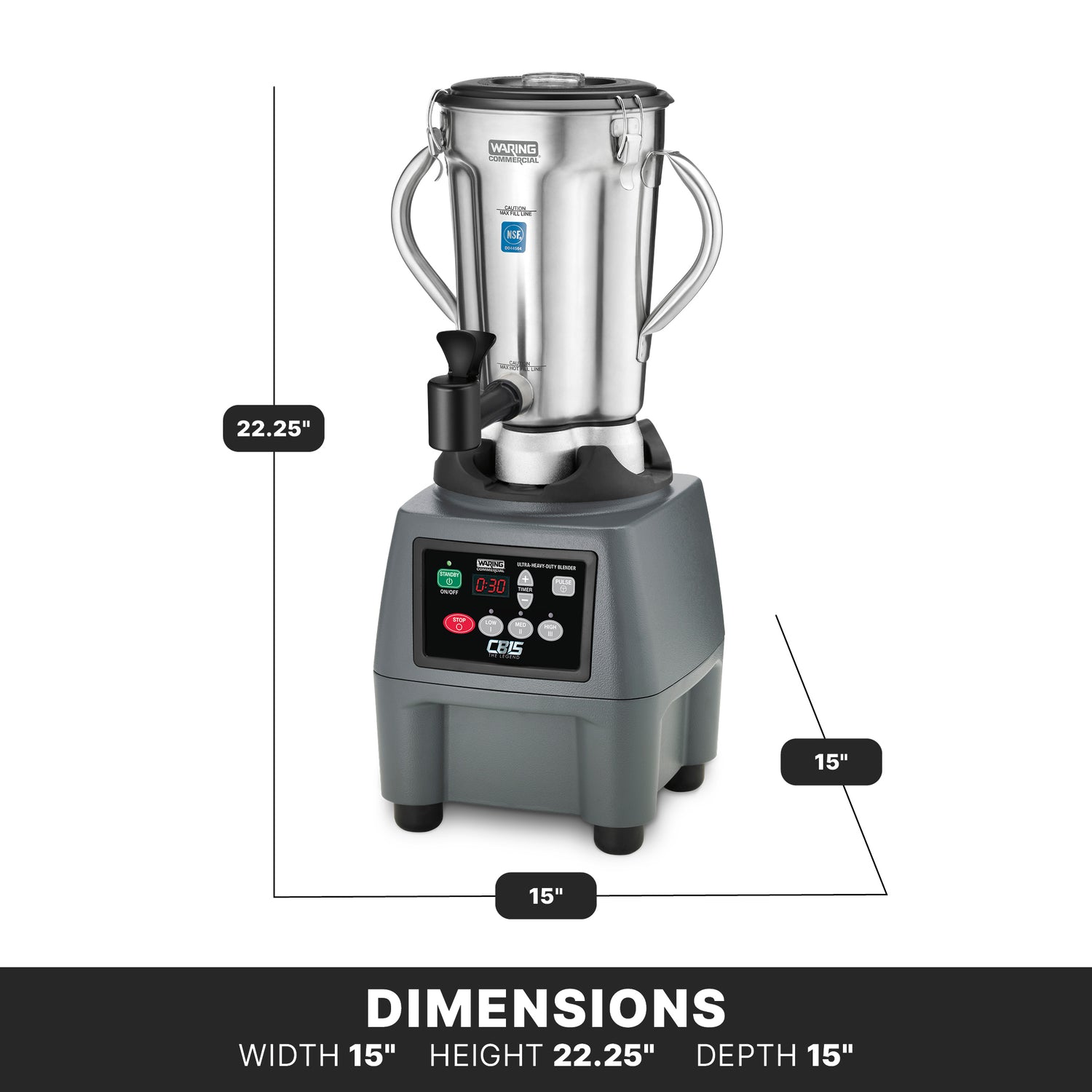 The Waring CB15TSF Food Blender is a high-capacity, commercial-grade countertop blending appliance designed for professional foodservice environments. Featuring a 1-gallon removable stainless steel container and a robust 3.75 HP motor, this heavy-duty equipment delivers reliable, powerful performance in high-volume operations. Its electronic membrane keypad offers precise control with 3-speed settings, a timer, and pulse function, making it suitable for smooth pureeing and ingredient prep in busy kitchens. With dimensions of 14-7/8" W x 15" D x 26" H and a painted exterior finish, it is engineered to withstand demanding use while maintaining ease of maintenance and durability.