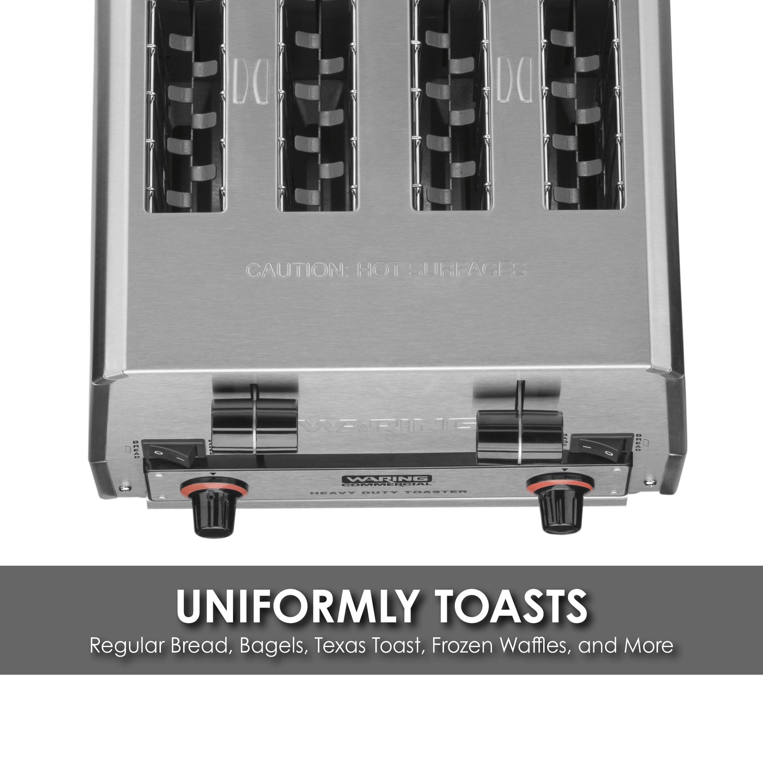 The Waring WCT850K commercial toaster offers precise browning with two rotary controls, high throughput with four 1-1/2" slots, and durable construction with a stainless steel exterior. Designed for high-volume foodservice operations, it supports quick maintenance through a removable crumb tray and replaceable industrial heating plates, meeting the demands of busy kitchens and bakery stations.