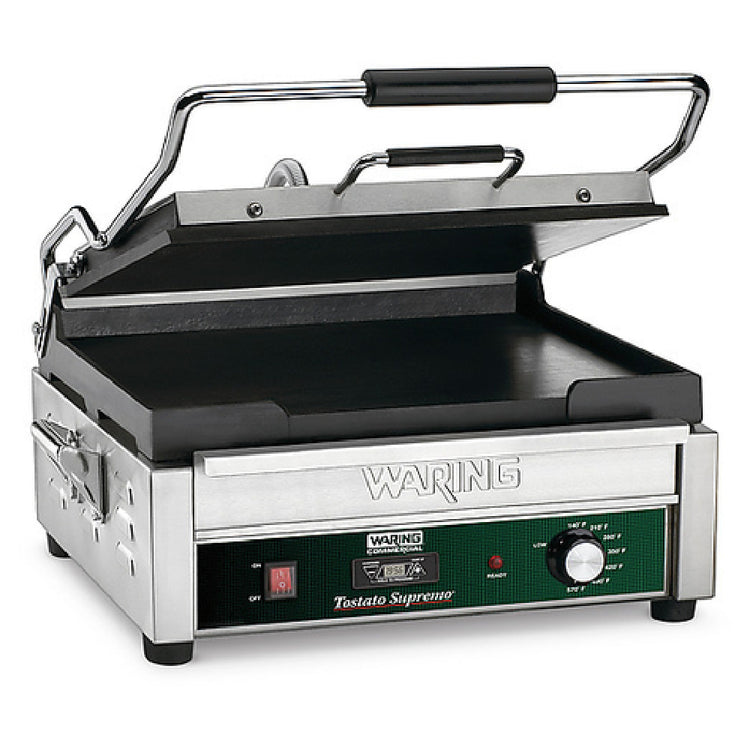 The Waring WFG250T Tostato Supremo™ Large Toasting Grill Electric Single is a commercial-grade sandwich and panini grill designed for high-efficiency foodservice operations. Featuring a substantial 14-1/2" x 11" cooking surface, this unit ensures consistent, even heat distribution with cast iron flat plates that support precise toasting and grilling. The hinged auto-balancing top plate, equipped with heat-resistant handles, facilitates uniform contact with food, optimizing throughput in busy kitchen environments. With adjustable thermostats reaching up to 570°F, it allows for versatile application across various bread and sandwich types, making it well-suited for multiservice restaurant settings and quick-serve operations. Its durable stainless steel body, integrated timer, indicator lights, and removable drip tray provide ease of cleaning and maintenance, ensuring reliable performance in demanding commercial contexts.