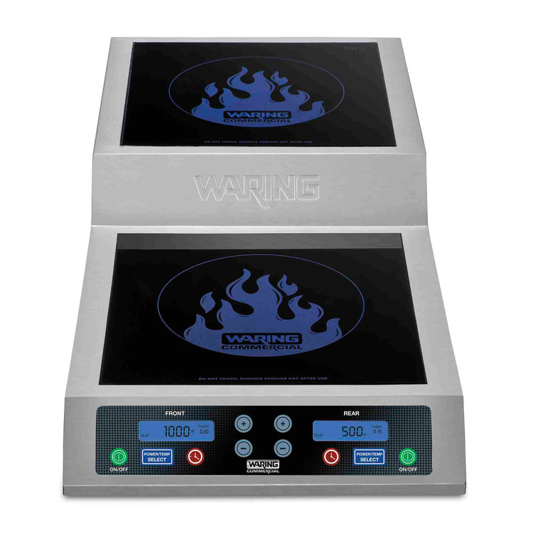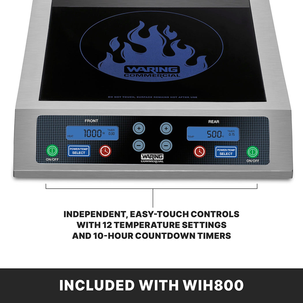 The Waring WIH800 Induction Range Countertop Double Hob is a commercial-grade cooking unit designed for high-efficiency foodservice operations. This countertop induction range features two 11" x 11" Schott® ceramic glass cooking tops with durable construction, enabling precise temperature control across 12 settings from 120° to 500°F (79° to 260°C). Equipped with touch controls, dual modes—heat (power) and temperature (hold)—and pan detection, this model optimizes workflow and energy efficiency in professional kitchens. With a power draw of 3.6kW at 208/240V, single-phase operation, and a 10-hour countdown timer, it provides versatile functionality suitable for fast-paced culinary environments requiring reliable, fast heating solutions.