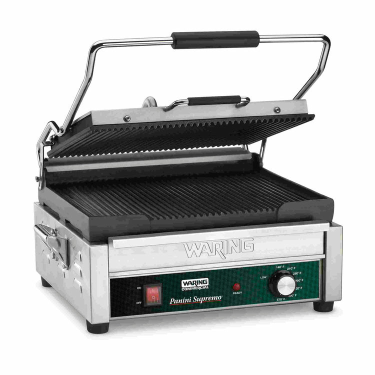 The Waring WPG250 Panini Supremo™ Large Panini Grill Electric Single is a commercial-grade sandwich and panini grill designed for high-efficiency foodservice operations. Featuring a substantial 14-1/2" x 11" cooking surface, it offers precise temperature control up to 570°F (300°C) with manual controls, ensuring consistent heat distribution. Built with ribbed cast iron plates and a hinged auto-balancing top plate, this model facilitates uniform grilling of sandwiches, melts, and pressed specialty items. Its stainless steel construction combines durability with easy maintenance, while the removable drip tray enhances operational sanitation. The unit operates on a 1.8kW power supply at 120V/60Hz, suitable for busy commercial kitchens seeking reliable, restaurant-ready equipment optimized for medium-volume output.