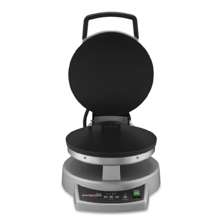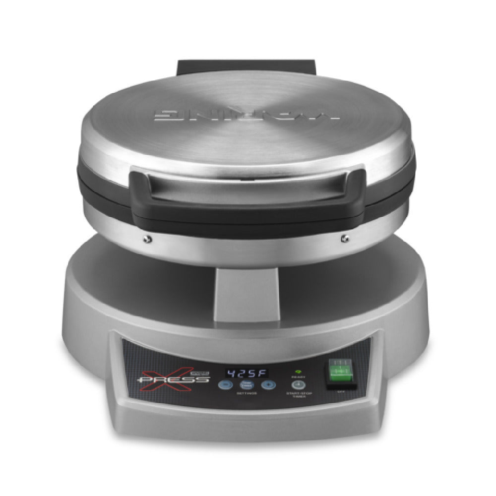 The Waring WSC300-120V XPress™ Multipurpose Cooktop Crepe Maker Electric is a commercial-grade cooking appliance designed for efficient crepe preparation and multitasking in professional kitchens. Featuring a 13.5-inch aluminum cooking surface, this electric unit offers dual-sided cooking to streamline production and enhance workflow. Its electronic touchpad provides precise temperature regulation from 125°F to 425°F (52°C–218°C), ensuring consistent results. Built with durable materials and NSF certification, the Waring crepe maker meets rigorous food safety and sanitation standards, making it suitable for high-volume foodservice environments requiring reliable, precise control over cooking parameters.