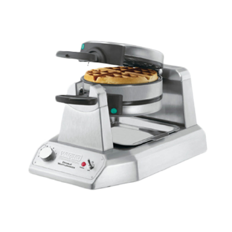 A commercial waffle maker is a high-capacity cooking appliance designed for foodservice operations to produce large quantities of waffles efficiently. The Waring WW200 Belgian Waffle Maker Double features dual cast iron grids and thermostatic controls, enabling consistent cooking with up to 50 round 7" waffles per hour. Installed in restaurants, catering, or breakfast service setups, it supports medium-duty workloads and high-volume throughput, making it suitable for busy kitchens aiming for quality presentation and quick service.
