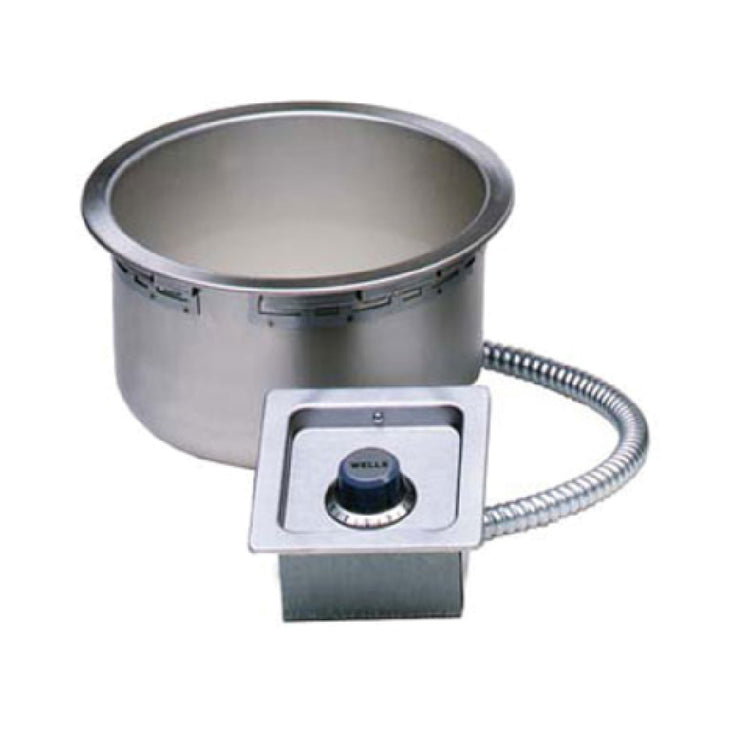 The Wells SS-10TDUC_208-240/60/1 Food Warmer Top-mount Built-in is a commercial-grade electric hot food well designed for precise temperature control and reliable operation within professional foodservice environments. Crafted with durable stainless steel construction, this unit supports 11-quart round inserts, making it suitable for banquet, buffet, and cafeteria applications. Its non-insulated design features thermostatic controls for consistent warming, combined with a built-in drain system for efficient cleaning and maintenance. The top-mount configuration facilitates seamless integration into existing counters, optimizing workflow and space utilization. Exact specifications include dimensions of 12 inches in width and depth with an 8.75-inch height, weighing approximately 7 pounds, and operating on a voltage of 208-240V at 60Hz. This unit's robust design and precise thermostatic regulation make it ideal for mid-volume catering and food presentation settings requiring steady heat and easy servicing.