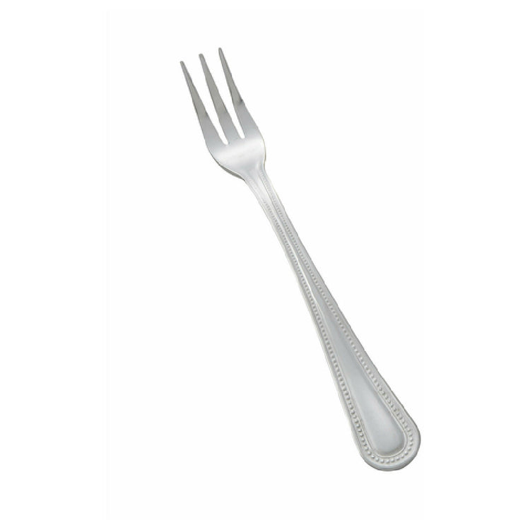 Winco 0005-07 oyster fork combines high-quality 18/0 stainless steel with a heavy weight design that resists corrosion and daily wear. Its mirror finish and dotted grip pattern deliver both functionality and aesthetic appeal, supporting streamlined seafood service in demanding commercial environments. Compared to other utensils, this model offers a superior balance of durability, ease of cleaning, and presentation, enhancing operational efficiency during high-volume seafood plating.