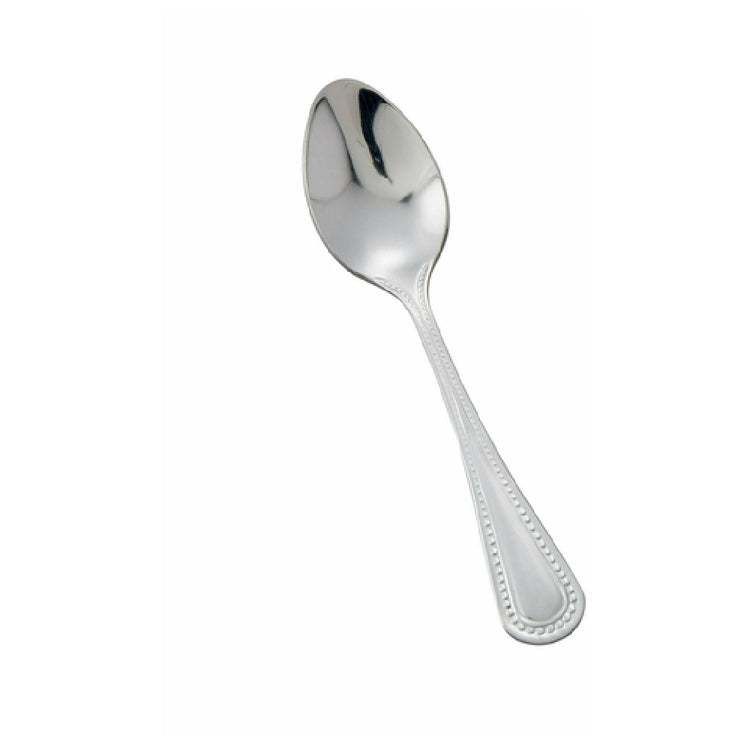 The Winco 0005-09 demitasse spoon features a precise 4-3/4" length and a width of 4.75 inches, crafted from high-quality 18/0 stainless steel that ensures durability and corrosion resistance suitable for continuous commercial dishwashing cycles. Weighing 0.56 lbs per piece, this spoon maintains a substantial feel, supporting handling during extended service periods. Its mirror finish and dotted pattern provide an elegant appearance aligned with restaurant aesthetics. The utensil is designed for use in high-traffic foodservice stations, with a maintenance-friendly surface requiring only regular cleaning. Dimensions and weight optimize storage and ergonomic handling, making the spoon compatible with standard flatware caddies and serving trays.