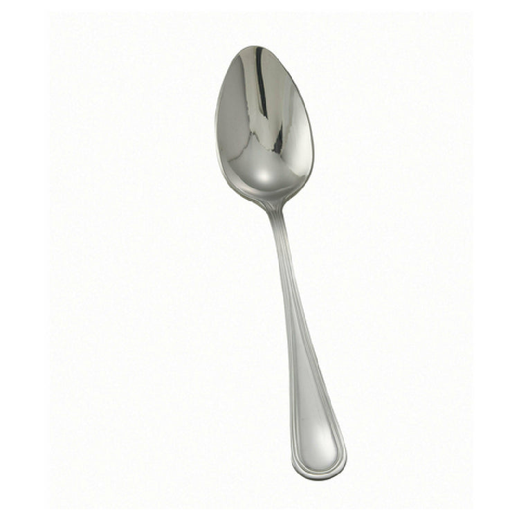 The Winco 0030-10 European Tablespoon features a precise 8-1/4 inch length with an 18/8 stainless steel construction, providing superior corrosion resistance and durability. It weighs 2.15 lbs per dozen, ensuring substantial heft for controlled serving. The mirror finish enhances ease of cleaning, supporting efficient sanitization processes typical in commercial environments. Its robust build supports intensive use, and the material's thermal stability allows safe handling without warping or discoloration during extensive use. Designed without certification labels, it emphasizes functionality and long-term performance in restaurant and institutional settings, where the focus is on reliability and uniformity.
