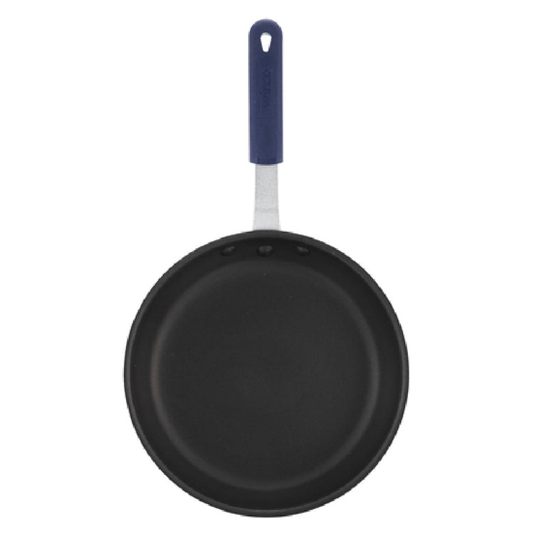 Winco AFP-10XC-H 10 Inch Fry Pan Round Without Lid Riveted Handle Aluminum Blue Silicone Sleeve