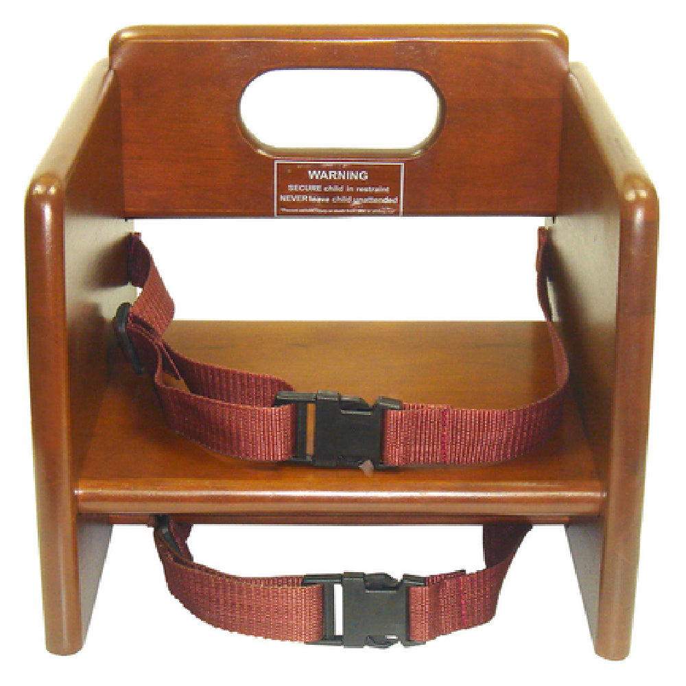Winco, CHB-704, Booster Seat, stacking, 11-3/4"L x 11-3/4"W x 10-1/2"H, waist and chair straps, rubberwood, walnut finish, ASTM compliant