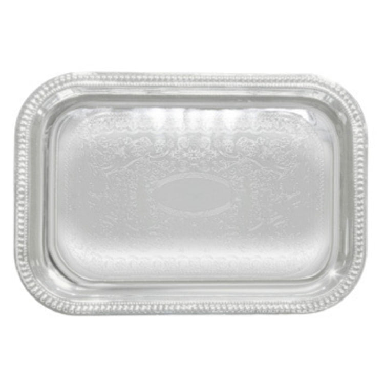 Constructed from chrome-plated metal, the Winco CMT-1812 measuring 18 inches in length and 12-1/2 inches in width offers a lightweight design at 1.67 lbs, facilitating easy handling during service. Its rectangular shape with a gadroon edge and traditional engraving lends an upscale appearance to food displays. Designed for commercial use, it supports hand washing only to maintain surface integrity, with dimensions optimized for countertop or display shelving. The tray’s propylene finish provides resistance to chipping and scratching, suitable for daily sanitation routines, while its compact footprint fits standard storage spaces within bustling foodservice establishments.