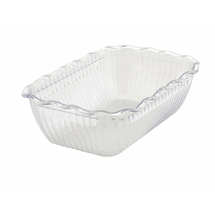 The Winco CRK-10C Deli Crock is a commercial-grade plastic food storage solution designed specifically for foodservice operations requiring durable and transparent containers. This rectangular deli crock measures 10 inches by 7 inches with a height of 3 inches, making it suitable for countertop or prep station use in cafés, delis, and buffet lines. Crafted from SAN plastic and free from BPA, it ensures food safety and resistance to impact, scratches, and staining. Its fluted design provides an aesthetic upgrade while maintaining practicality for storing sliced, chopped, or prepared ingredients, facilitating efficient workflow in busy kitchens. The clear construction allows quick identification of contents, supporting effective inventory management and display. Engineered to meet industry standards, the CRK-10C is an essential component for precise food portioning and presentation in commercial foodservice environments.