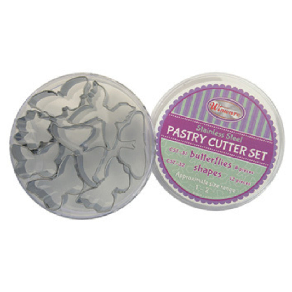 The Winco CST-31 Cookie Cutter Set is a professional-grade collection of stainless steel tools designed for commercial baking and pastry preparation. This 8-piece assortment features dimensions ranging from 1 to 2 inches in diameter, specifically crafted for precision cutting of cookie and dough shapes. The set's butterfly motifs highlight its utility in high-volume bakery, catering, or restaurant kitchens requiring consistent, food-safe cutters. With rust-resistant construction and a convenient storage container included, the set simplifies workflow and maintains hygiene standards in busy culinary environments.