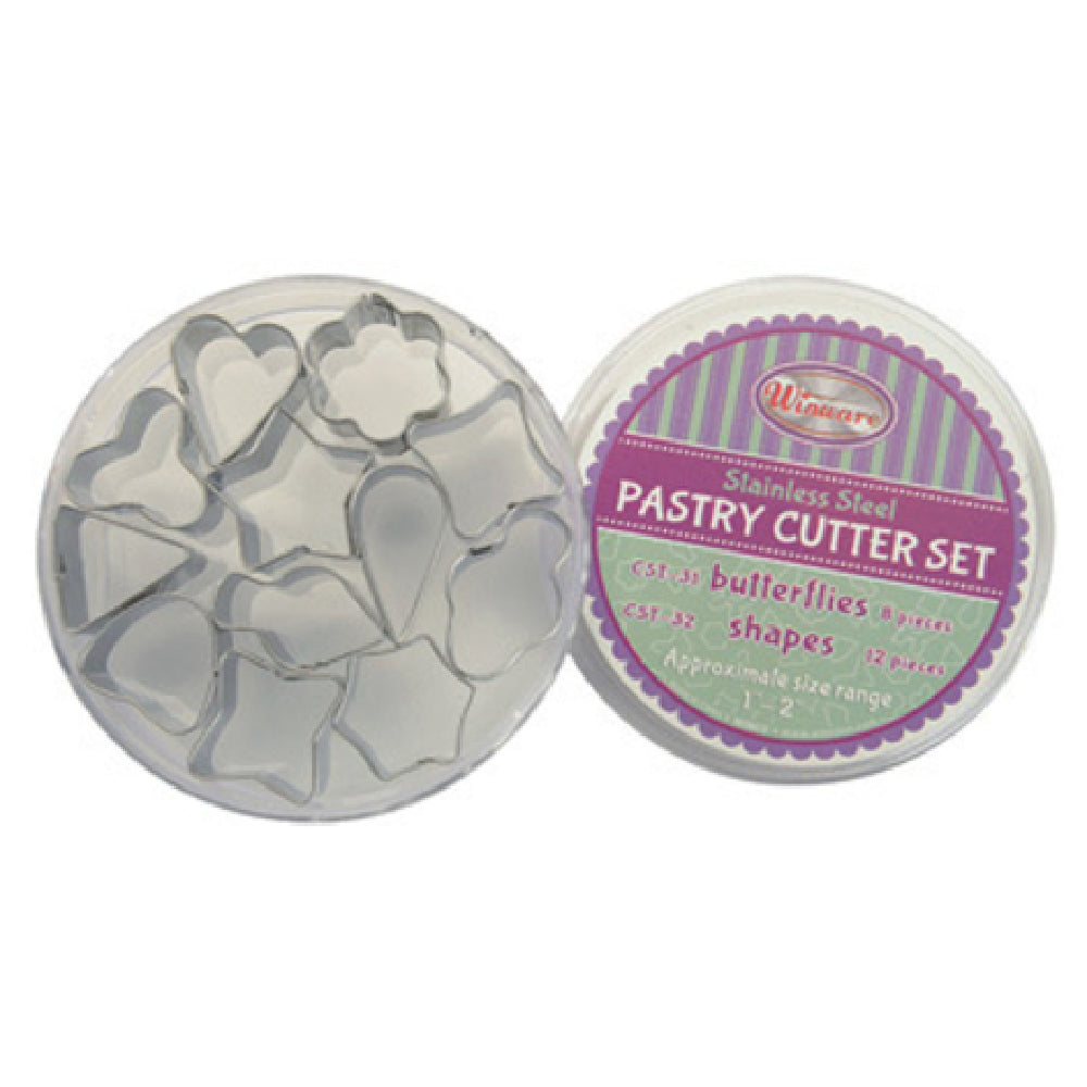 The Winco CST-32 Cookie Cutter Set features a stainless steel construction with a gauge optimized for durability and ease of cleaning, suitable for high-volume bakery environments. Each cutter measures between 1 and 2 inches in diameter, with a total weight of 0.25 lbs per piece. The set includes assorted shapes designed to handle dough and pastry applications efficiently, with a compact storage container included for space-saving organization. Its corrosion-resistant material withstands routine cleaning and sanitization protocols typical of commercial kitchens, ensuring longevity and safe food contact in busy foodservice stations.