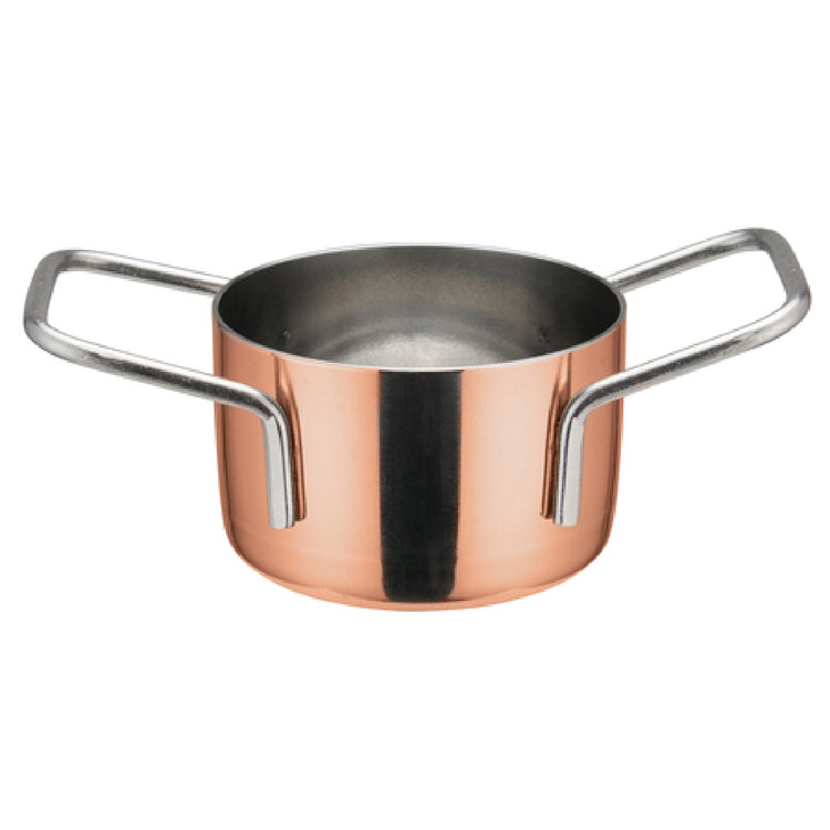 This mini casserole is optimized for commercial foodservice use, featuring a copper plated, round construction that ensures even heat conduction and resistive durability. Its compact size allows for versatile application in tabletop service or prep stations. Designed with ease of cleaning and handling, it supports efficient workflow in busy kitchens, making it ideal for portion-controlled servings and garnishing tasks.