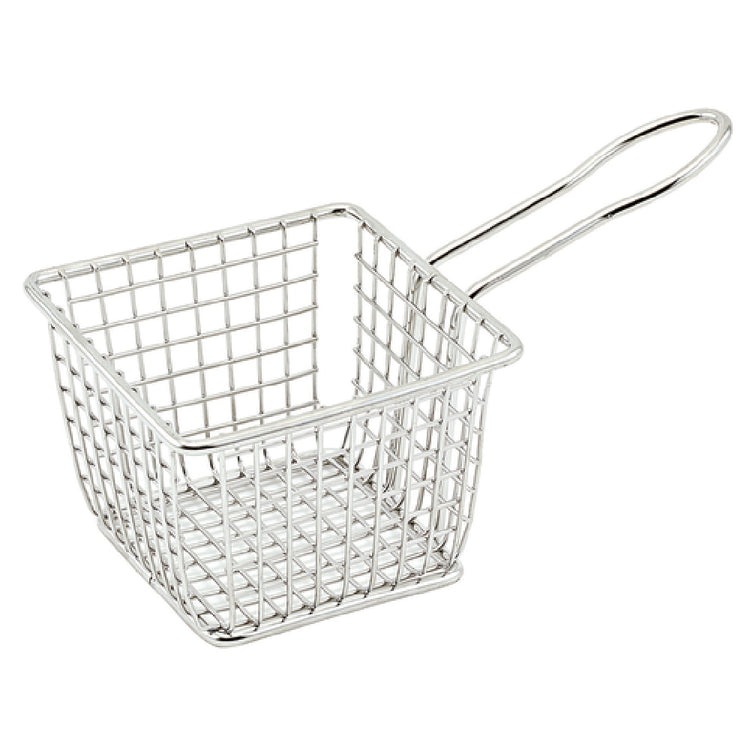 The Winco FBM-443S mini fry basket is tailored for commercial kitchens requiring precise portioning and fast turnover. Its stainless-steel construction allows for high-temperature operation and easy sanitation. Designed for handheld use, it fits seamlessly into standard fryers. Its compact 4" x 4" square footprint optimizes workflow in small cook stations, supporting consistent product presentation and rapid cleaning cycles for efficient service.