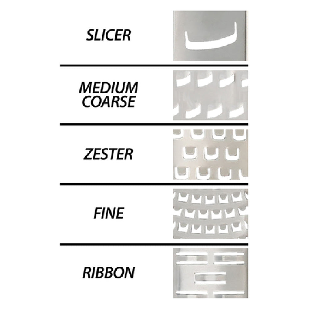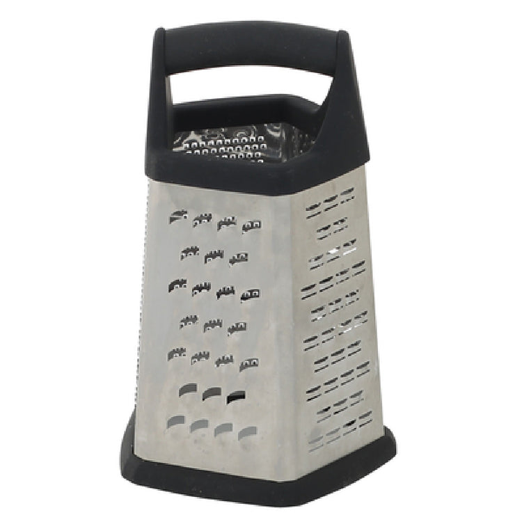 Winco, GT-401, Grater, 5 sided grater (slicer/medium coarse/zester/fine/ribbon), 5"L x 5"W x 8"H, anti-slip feet, black soft grip handle, etched 18/8 stainless steel