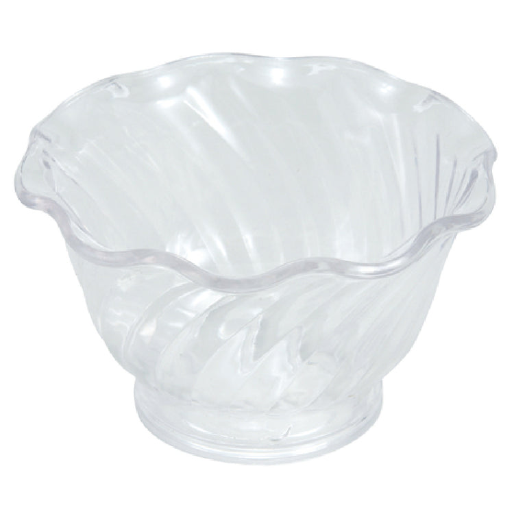 A commercial ice cream sundae dessert dish is a durable, food-safe container designed for serving ice cream, berries, and other desserts in high-volume foodservice settings. Specifically, the Winco ICC-5C model features a 5 oz. capacity made from impact-resistant SAN plastic, offering clarity and safety for consistent presentation and portion control. It is typically used in cafes, dessert bars, and buffet lines where reliable, dishwasher-safe dishware is essential for efficient operation. This dish’s sturdy construction helps handle frequent use while maintaining presentation quality, making it suited for environments requiring quick turnaround and safety compliance. Ideal for mid-volume restaurant or catering service, this dish supports precise quantities and attractive displays under fast-paced conditions.