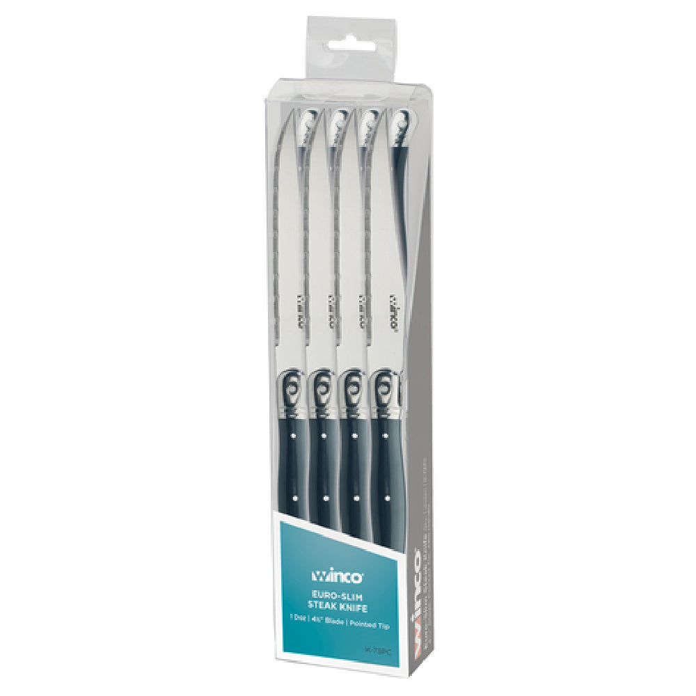 The Winco K-73PC Steak Knives are a professional-grade cutlery item designed for commercial foodservice environments. Featuring a precisely machined 4-1/2" stainless steel blade with a pointed tip, these knives deliver superior slicing performance for steak and other meats. With an overall length of 9 inches, the Euro slim ABS handle provides a balanced grip, facilitating efficient workflow during food prep and service. This knife is an essential tool for high-volume restaurants, steakhouses, and catering operations seeking durable, hygienic, and precise cutting instruments in their kitchen arsenal.