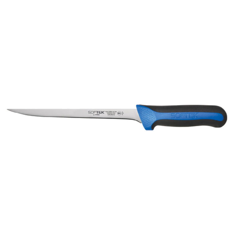The Winco KSTK-82 Sof-Tek™ Fillet Knife features an 8-inch flexible blade constructed from high-quality X50CrMoV15 German steel, offering precision and durability essential for commercial seafood processing. Its non-slip black and blue TPR handle provides secure grip and comfort during prolonged use, making it suitable for professional kitchens, fishmongers, and foodservice establishments requiring precise filleting tools. The knife's design emphasizes high performance, ease of handling, and resistance to wear, making it an indispensable part of high-volume seafood preparation workflows.