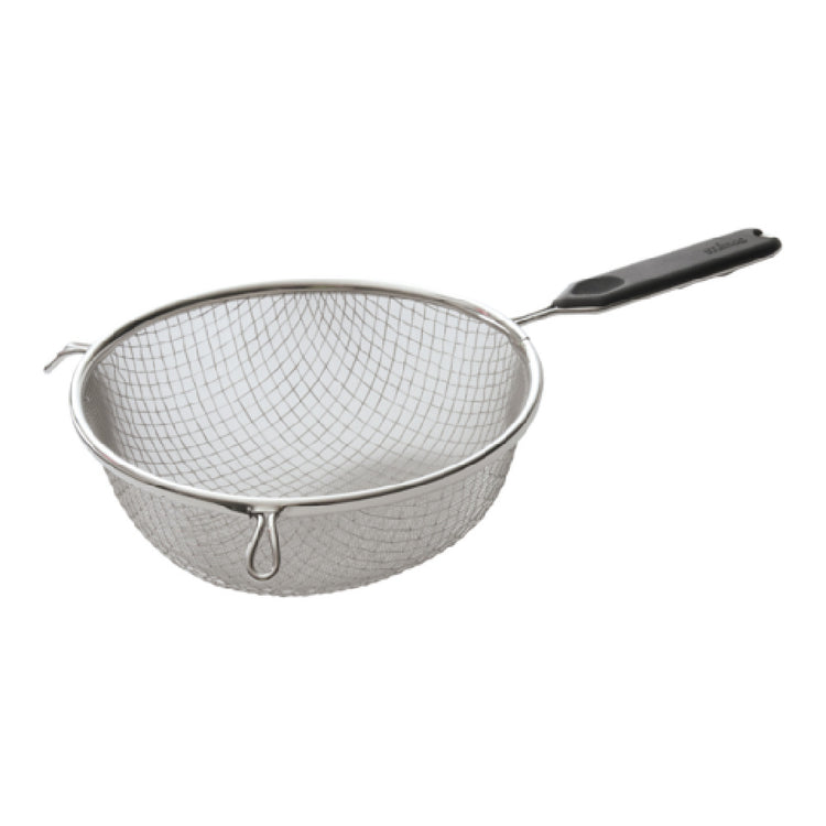 Built for professional kitchens, the Winco MSTP-8DF mesh strainer offers robust filtering, stainless steel durability, and a compact design suited for high-volume food processing operations like sauce preparation or ingredient sorting in restaurant or catering environments.