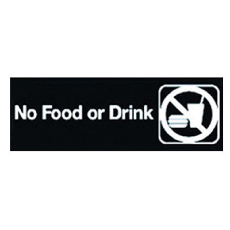 The Winco SGN-333 Sign is a durable, 9-inch by 3-inch compliance sign designed for commercial foodservice environments. Featuring a high-contrast white imprint on a black background, it clearly communicates "No Food or Drink" restrictions. As a commercial-grade sign, it is suitable for installation in kitchens, cafeterias, and food prep areas to maintain safety protocols and preventative messaging. The compact size and robust construction make it an essential visual aid for compliance management within busy foodservice operations—precisely engineered to withstand routine cleaning and handling in institutional settings.