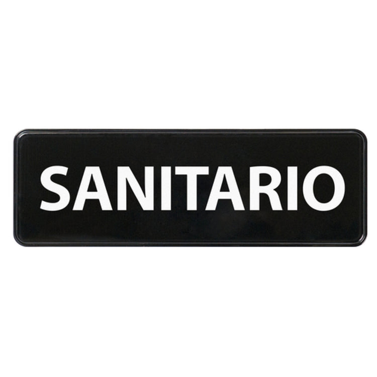 Winco, SGN-367, Information Sign, with symbol, 9" x 3"H, "Sanitize" in Spanish, white imprint on black, plastic with adhesive back