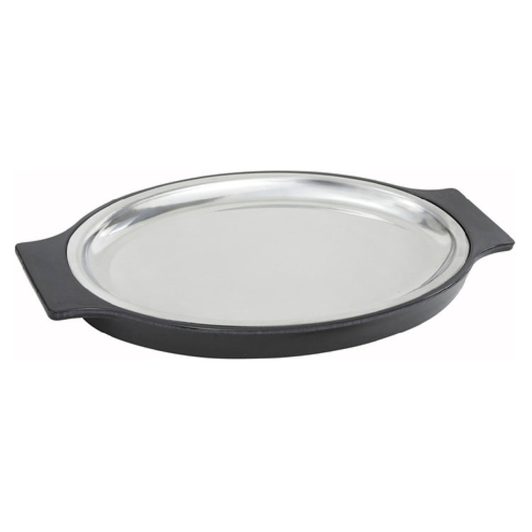 The Winco SIZ-11ST Sizzle Thermal Platter Set features a stainless steel oval platter with a size of 11 inches, weighing approximately 2.04 pounds. Crafted from durable, oven-safe stainless steel, it accommodates oven temperatures reliably for heat retention and presentation. The set includes a Bakelite® underliner designed for insulation and ease of handling, providing resistance to heat transfer during service. Its construction supports high-volume foodservice environments, such as catering and buffet stations, where robust, hygienic, and professional-grade serveware is essential. The platter’s dimensions make it compatible with standard oven racks and buffet setups, while its finished surfaces facilitate quick cleaning and sanitation procedures. The set's design emphasizes durability, operational efficiency, and the ability to maintain food temperature during transit and display, contributing to streamlined kitchen workflows and improved product presentation.