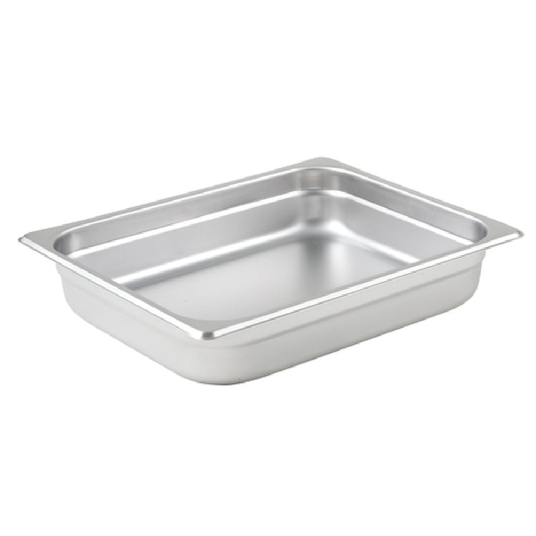 The Winco SPJL-202 steam table pan is a commercial-grade, stainless steel foodservice accessory designed for professional catering, buffet, and hot holding applications. This 1/2 size pan measures 10-3/8 inches by 12-3/4 inches and features a 2-1/2 inch depth, constructed from durable 18/8 stainless steel with a 25-gauge standard weight for reliable performance. Its anti-jamming design facilitates stacking efficiency, reducing operational downtime during volume service. Suitable for hot or cold preparation workflows, this pan provides precise heat retention, and its robust material supports frequent handling and cleaning. Engineered for high-volume use, it ensures consistent food presentation and operational efficiency in busy commercial kitchens.