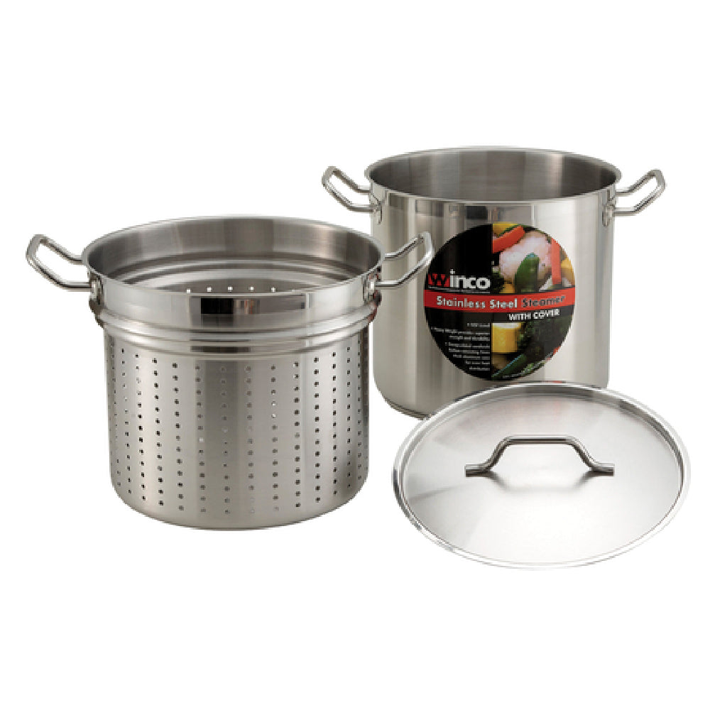 Winco, SSDB-12S, Steamer/Pasta Cooker, 12 qt., 10-1/4" dia. x 9-3/8"H, round, perforated, with cover, induction ready, tri-ply heavy duty bottom with aluminum core, 18/8 stainless steel, NSF
