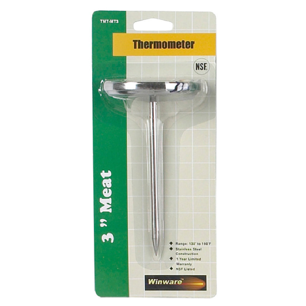 The Winco TMT-MT3 Meat Thermometer is a precise temperature measuring instrument designed for professional foodservice environments. Featuring a 3-inch diameter dial face with a durable stem and a 5-inch probe, this thermometer enables accurate readings within a temperature range of 130°F to 190°F. Built to withstand commercial kitchen conditions, it is essential for monitoring meat and other food products during processing and cooking, ensuring consistent quality and safety in high-volume culinary operations.