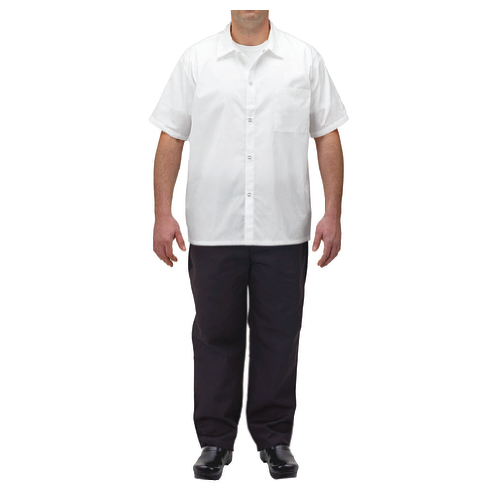 A commercial chef's shirt is a professional uniform designed for kitchen staff, providing functional features suited for high-paced foodservice environments. The Winco UNF-1WXL Broadway Chef Shirt is an example of a durable, easy-care short-sleeved chef shirt constructed from a poly-cotton blend with snap buttons and utilitarian design. Installed in busy restaurant kitchens and catering operations, this style supports practical workflow needs such as quick clothing changes, stain resistance, and easy laundering, making it ideal for culinary professionals in fast-moving foodservice settings.