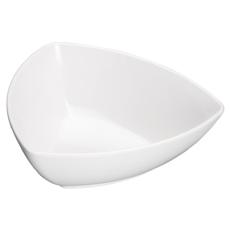 The Winco WDM005-201 Bowl is constructed from durable melamine with a clean white finish, measuring 7 inches in width and featuring a triangular shape optimized for stacking and storage. It offers a capacity of 3/4 quart (24 oz.), suitable for portioning and serving in high-traffic environments. The bowl weighs approximately 15.62 lbs per case, with each case containing 24 units. It is dishwasher safe, designed to withstand constant cleaning cycles, and is rated for typical foodservice temperatures, ensuring safe handling and reliable performance. The bowl’s construction supports heavy usage, maintaining its integrity and appearance over time in commercial kitchens and catering operations.