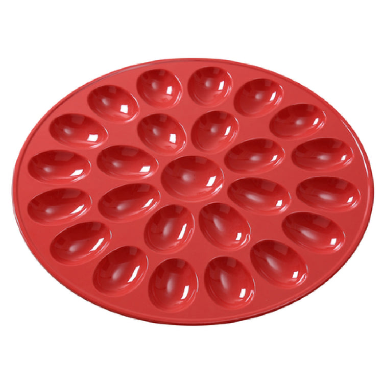 This commercial egg holder is built with NSF-rated, dishwasher-safe melamine, ensuring durability and compliance with sanitation standards. It measures 12-1/2 inches in diameter with a height of 3/5 inches and weighs approximately 10.71 pounds, providing a stable platform for 25 eggs. The product's bright red color adds visibility in busy foodservice environments, supporting HACCP workflows and easy handling in institutional kitchens. It does not require assembly, features a food-safe surface, and is designed for quick cleaning and maintenance, supporting operational efficiency and consistent food safety practice.